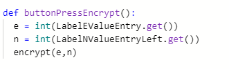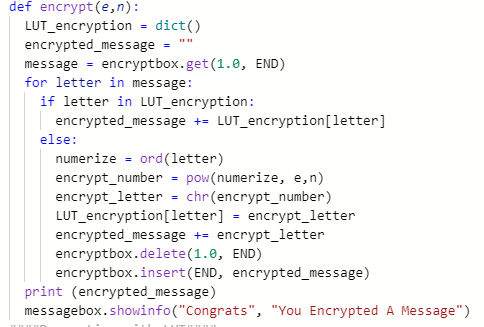 The procedure takes the e and n values. You then write out your message and then your message becomes encrypted. This is achieved by running the encrypt function with the values. The message is then displayed in a textbox. The encryption function is a necessary part of my program. You need to write a function that takes two values e and n and you should be able to input those values into an entry box and the function should be called when you press the encrypt button. The encryption function grabs a message put in by the user and then numerizes it by using the two values. The numerized message is then characterized and spit out into an entry box. You can then decrypt this message.